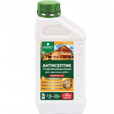 PROSEPT EXTERIOR предназначен для защиты и консервации древесины различных пород (от гниения, плесени, синевы и насекомых-древоточцев), эксплуатируемой на открытом воздухе при непосредственном воздействии атмосферных осадков, почвенной влаги, гигроскопическом и конденсационном увлажнении.
