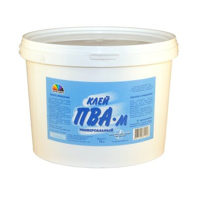 Клей ПВА М универсальный - применяется для склеивания изделий из бумаги, картона, кожи, тканей. Подходит для приклеивания линолеума, ковролина, облицовочной плитки, синтетических стеновых покрытий на бумажной основе, стекловолоконных, виниловых и бумажных обоев, пробки, серпянки, строительных сеток и бинтов. Может использоваться для приклеивания декоративного бумажно-слоистого пластика к ДВП, ДСП, МДФ и др., а также для увеличения водонепроницаемости и повышения прочности бетонных, штукатурных и шпатлевочных составов.