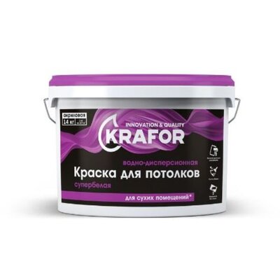 Краска для потолков супербелая водно-дисперсионная акриловая 14 кг (фиолетовая эт.), KRAFOR