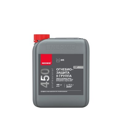 NEOMID 450 - высокоэффективный состав для огнезащиты и антисептирования древесины. Переводит древесину в трудновоспламеняемый и трудногорючий материал, обеспечивая II (вторую) группу огнезащитной эффективности согласно НПБ 251-98. Применяется для наружных и внутренних работ.