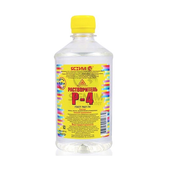 Растворитель Р-4 предназначен для разбавления лакокрасочных материалов на основе поливинилхлоридных хлорированных смол ПСХ ЛС и ПСХ ЛН, сополимеров винилхлорида, эпоксидных смол и других пленкообразующих веществ.