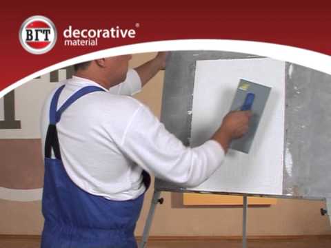 Способ нанесения: Роллерную декоративную штукатурку наносят широким шпателем или кельмой из нержавеющей стали толщиной не менее 3-5 мм. После нанесения штукатурка растирается пластиковой кельмой. В зависимости от времени, интенсивности и траектории движения пластиковой кельмы можно получить различные лабиринтные каналы: круговые, горизонтальные, вертикальные, крестообразные и др. Необходимо обратить внимание на некоторую специфику при работе с роллерной штукатуркой. В процессе нанесения и растира штукатурки на инструменте образуется избыточная жидкая масса материала, которую необходимо периодически снимать шпателем. Это облегчает работу по созданию необходимого рисунка. Принцип действия роллерной штукатурки достаточно прост. В ее состав входит небольшое количество крупной окатанной фракции мрамора. Эти небольшие шарики начинают кататься под воздействием вашей кельмы, создавая нерегулярный рельеф. В зависимости от размера этой крупной фракции можно получать различный размер борозд. Среднезернистая роллерная штукатурка изготовлена с глубиной борозд около 3 мм. При работе с роллерной штукатуркой также возникают проблемы стыков, поэтому нельзя бросать работу на ровной стене, нужно довести ее до угла.